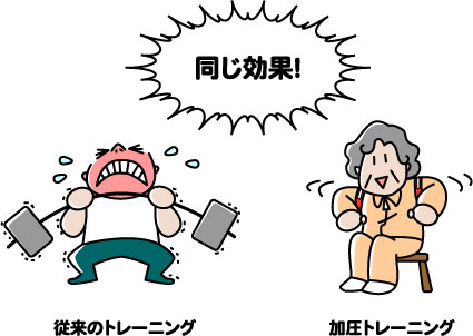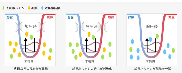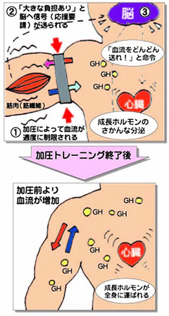 加圧トレーニングの最大の利点は、成長ホルモンの分泌量(普通のトレーニングの約10倍)です。成長ホルモンを分泌させて最大の効果を得るには、乳酸(運動中に発生する疲労物質)をいかに多く発生させて、休憩などで除去させないことが重要です。成長ホルモンは筋発達や体脂肪の分解に効果があります。
