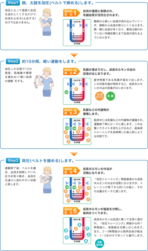 ④加圧トレーニング→成長ホルモン分泌→体脂肪分解→分解された体脂肪を有酸素運動で燃焼