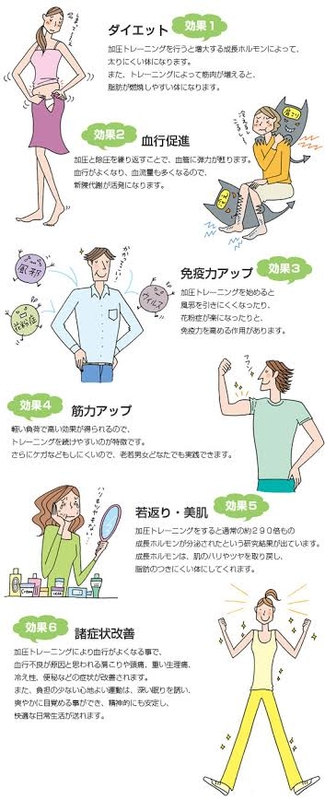 加圧トレーニングの効果を画像で載せました。老若男女に効果的ですが特に女性やシニアの方におすすめです。理由は少ない負荷で効率よく筋力アップできるからです。