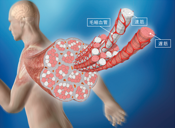 筋肉は主に速筋(※1)と遅筋(※2)の2種類に分かれます。通常、速筋は重い負荷のトレーニングで鍛えられ、遅筋は軽い負荷のトレーニングを長時間続ける必要があるため、通常2つの筋肉を同時に鍛えることはできません。加圧トレーニングを始めると、加圧しているために血流量が充分ではなく、すぐに活動を始めた遅筋の酸素が足りなくなります。これは、大きい負荷の運動を行っているのと同じ状態を人工的につくり出しているということです。そのため、通常はなかなか活動を始めない速筋が大きい負荷を受けたと脳が錯覚して、すぐに活動を開始するよう指示を出します。加圧トレーニングでは、軽い負荷で速筋と遅筋を同時に鍛えることができるのです。